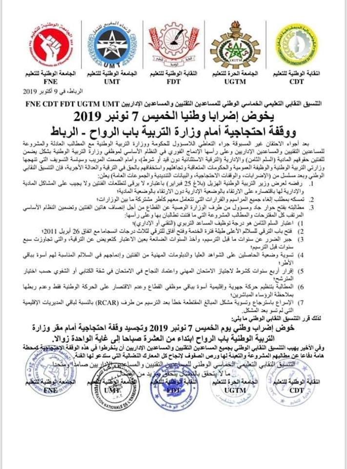 دعت خمس نقابات تعليمية مركزية بقطاع التربية الوطنية لإضراب وطني يوم الخميس 7 نونبر المقبل مصحوبا بوقفة احتجاجية صباح اليوم نفسه أمام مقر الوزارة على خلفية ما أسموه “أجواء الاحتقان غير المسبوقة جراء التعاطي اللامسؤول للحكومة والوزارة مع المطالب العادلة والمشروعة للمساعدين التقنيين والمساعدين الإداريين”.