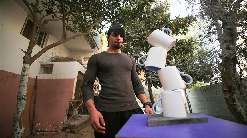 ويستخدم الشابّ العشريني في تحدياته معظم الأثاث المنزلية، مثل الكؤوس الزجاجية والعبوات الفارغة وأنابيب الغاز المنزلي والأخشاب، إضافة لبعض الأجهزة الكهربائية الثقيلة أبرزها “التلفاز”.