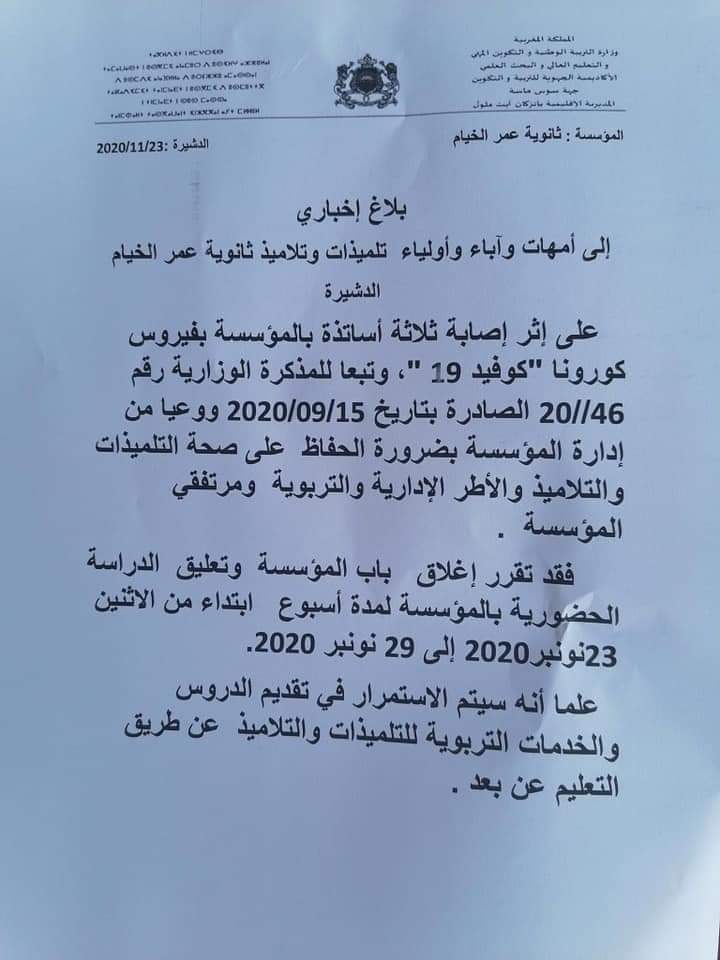فقد قررت المؤسسة إغلاق أبوابها وتعليق الدراسة الحضورية بالمؤسسة لمدة أسبوع إبتداء من غد الإثنين 23 نونبر 2020 إلى غاية 29 نونبر 2020.