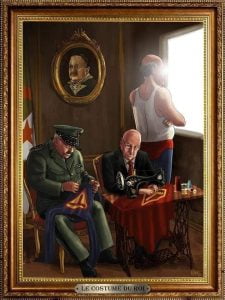 ويظهر في الرسم الكاريكاتوري عبد المجيد تبون وهو يجلس على كرسي الرئاسة بينما يقوم رئيس الأركان قايد صالح بوضع حذاء ذهبي في رجله، وحولهما تحلق الرئيس الموقت ورئيس الحكومة وأعضاء حكومته كمن يزف تبون إلى منصبه الجديد.