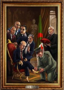 ويظهر في الرسم الكاريكاتوري عبد المجيد تبون وهو يجلس على كرسي الرئاسة بينما يقوم رئيس الأركان قايد صالح بوضع حذاء ذهبي في رجله، وحولهما تحلق الرئيس الموقت ورئيس الحكومة وأعضاء حكومته كمن يزف تبون إلى منصبه الجديد.