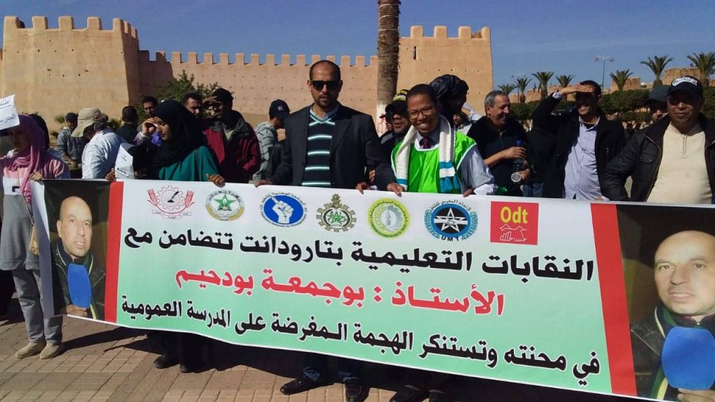 وبينما أعلنوا “تضامنهم مع الأستاذ المعتقل في محنته”، استنكروا ما سموه “الهجمة المغرضة على المدرسة العمومية”، رافعين يافطات كتب عليها “كلنا بوجمعة بودحيم”.