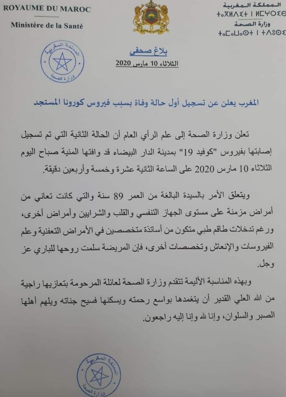 أعلنت وزارة الصحة أن الحالة الثانية، التي تم تسجيل إصابتها بفيروس “كوفيد 19” بالدار البيضاء، قد وافتها المنية اليوم الثلاثاء.