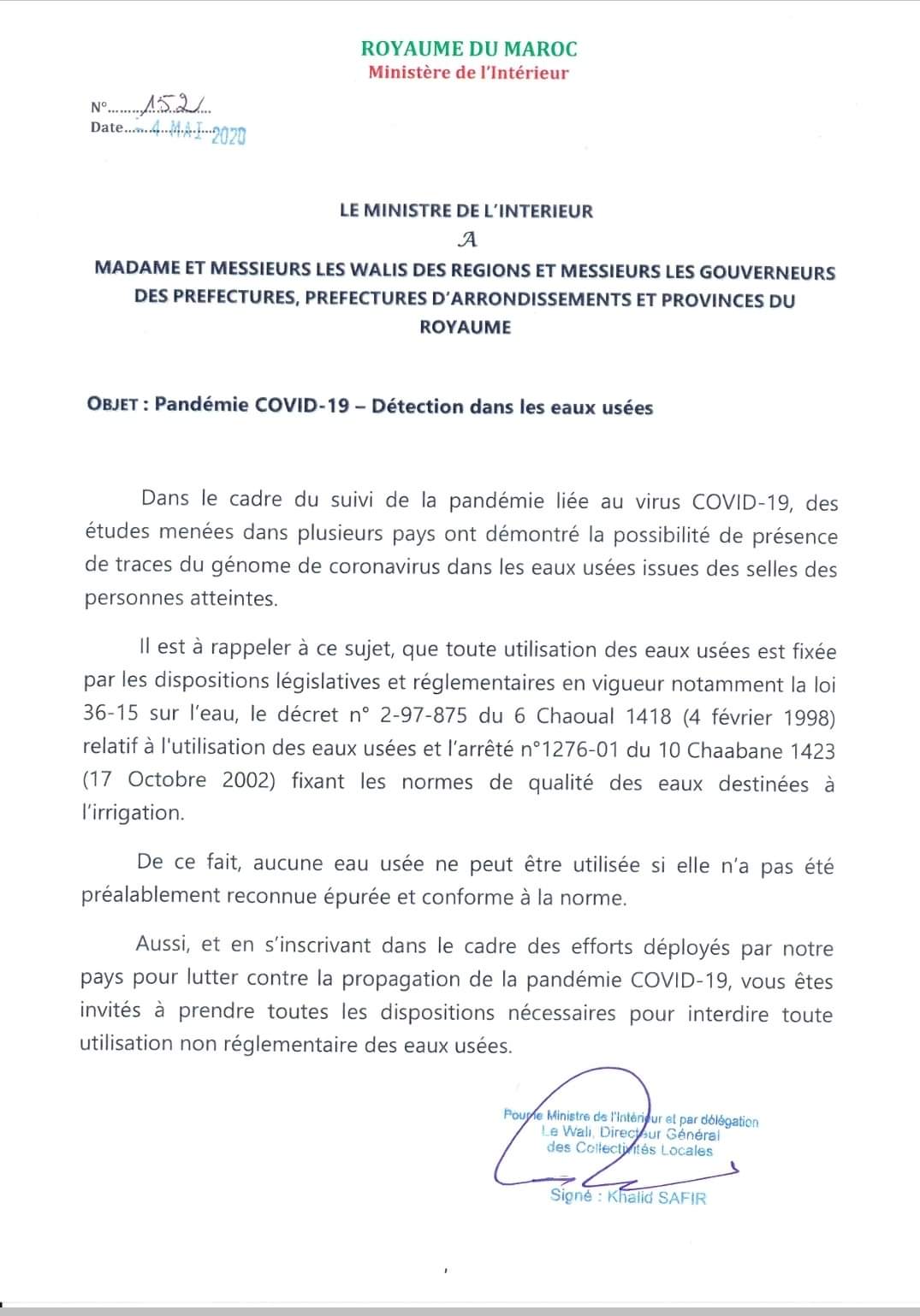 رفع وزير الداخلية عبد الوافي لفتيت مراسلة إلى ولاة وعمال أقاليم المملكة، تخص الكشف عن فيروس كورونا في مياه الصرف الصحي.