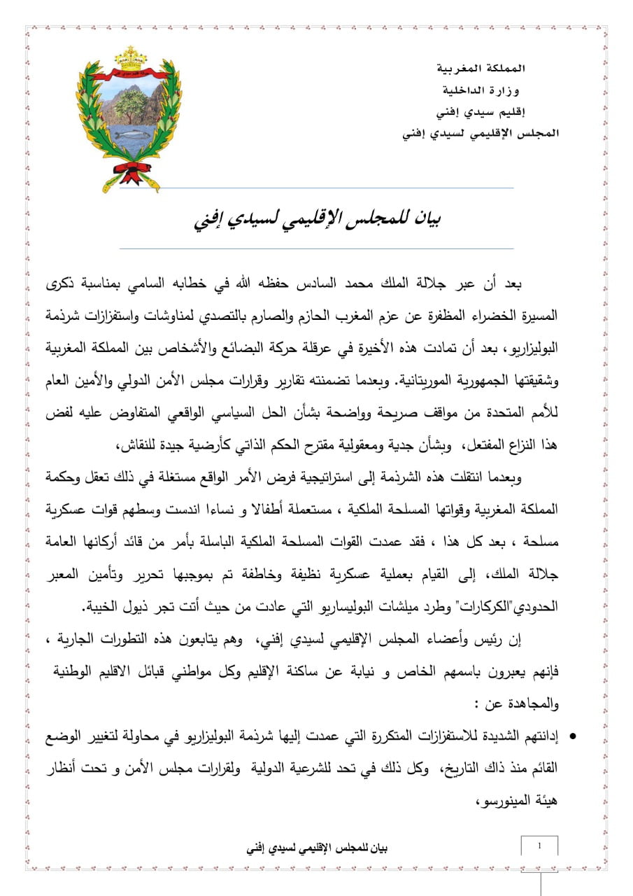 أصدر المجلس الإقليمي لسيدي إفني وهو يتابع التطورات الجارية في معبر الكركرات بيانا يعبر فيه باسمه ونيابة عن ساكنة الإقليم وكل مواطني قبائل الإقليم الوطنية والمجاهدة، عن إدانتهم الشديدة للإستفزازات المتكررة التي عمدت إليها شرذمة البوليزاريو في محاولة لتغيير الوضع القائم، وكل ذلك في تحد للشرعية الدولية ولقرارات مجلس الأمن وتحت أنظار هيئة المينورسو.