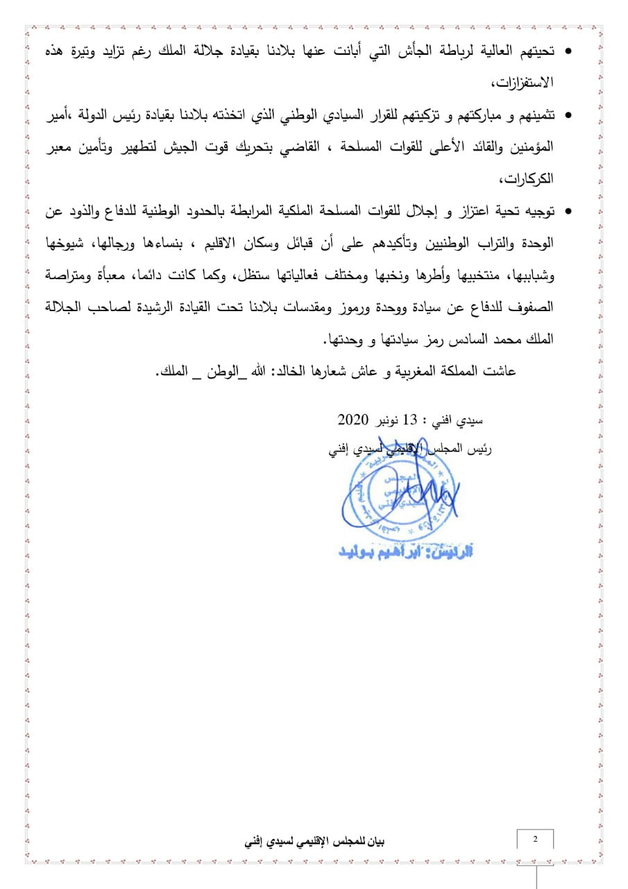 وختم المجلس الإقليمي لسيدي إفني بيانه بتوجيه تحية اعتزاز وإجلال للقوات المسلحة الملكية المرابطة بالحدود الوطنية للدفاع والذود عن الوحدة والتراب الوطنيين وتأكيده على أن قبائل وسكان الإقليم، بنسائها ورجالها، شيوخها وشباببها منتخبيها وأطرها ونخبها ومختلف فعالياتها ستظل وكما كانت دائما، معبأة ومتراصة الصفوف للدفاع عن سيادة ووحدة ورموز ومقدسات بلادنا تحت القيادة الرشيدة لصاحب الجلالة الملك محمد السادس رمز سيادتها ووحدتها.