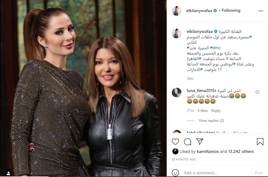 وتركت وفاء الكيلاني تعليقاً على الصورة قالت فيه: “الفنانة الكبيرة سميرة سعيد في أولى حلقات الموسم الثاني السيرة على dmc، يومي الخميس والجمعة الساعة 9 مساء بتوقيت القاهرة وعلى قناة أبوظبي يوم الجمعة الساعة 11 بتوقيت الإمارات”.