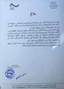 أصدر رئيس المجلس الجماعي لمدينة أكادير “صالح المالوكي”، بلاغا أكد فيه عن توقيف جميع الأنشطة التي تحتضنها المركبات والقاعات الرياضية وملاعب القرب والمراكز الثقافية والسوسيو اجتماعية والمكتبات والخزانات الجماعية بالمدينة بداية من يومه السبت 14 مارس الجاري حتى إشعار آخر.