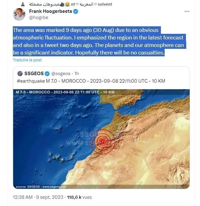 وأضاف هيجوربيتس في تغريدة على موقع تويتر قبل قليل قائلاً إنه قد أكد توقعاته الأخيرة لحدوث زلزال في تلك المنطقة بنواحي مراكش، وأيضًا في تغريدة قبل يومين.