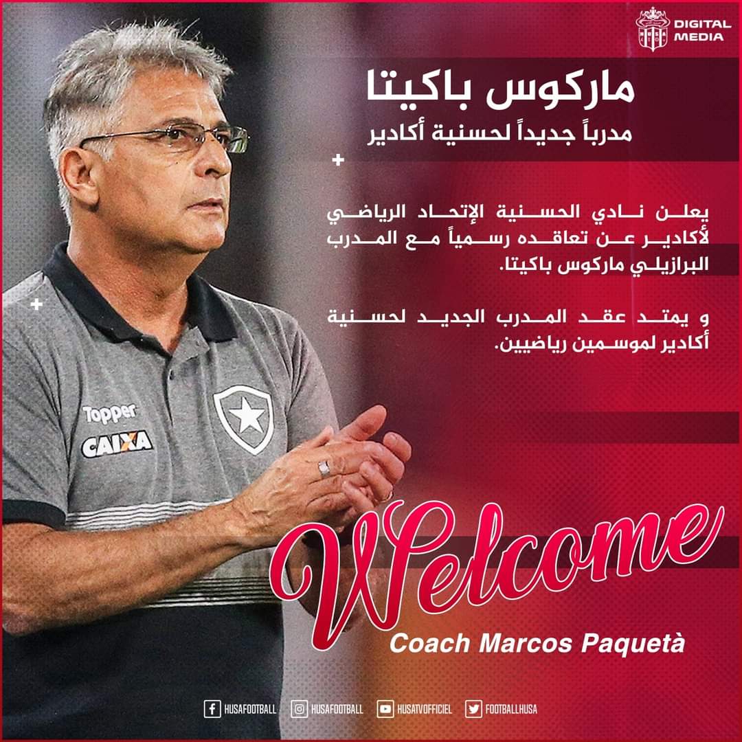 أعلن نادي حسنية أكادير، تعاقده بشكل رسمي مع المدرب البرازيلي ماركوس باكيتا، لموسمين قادمين خلفا لعبد الهادي السكتيوي.