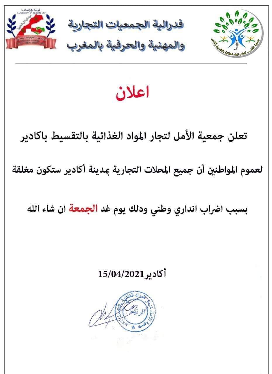 أعلنت جمعية الأمل لتجار المواد الغذائية بالتقسيط بأكادير لعموم المواطنين أن جميع المحلات التجارية بمدينة أكادير ستكون مغلقة يوم غد الجمعة بسبب إضراب وطني إنذاري احتجاجا على طريقة احتساب المساهمة المهنية الموحدة.