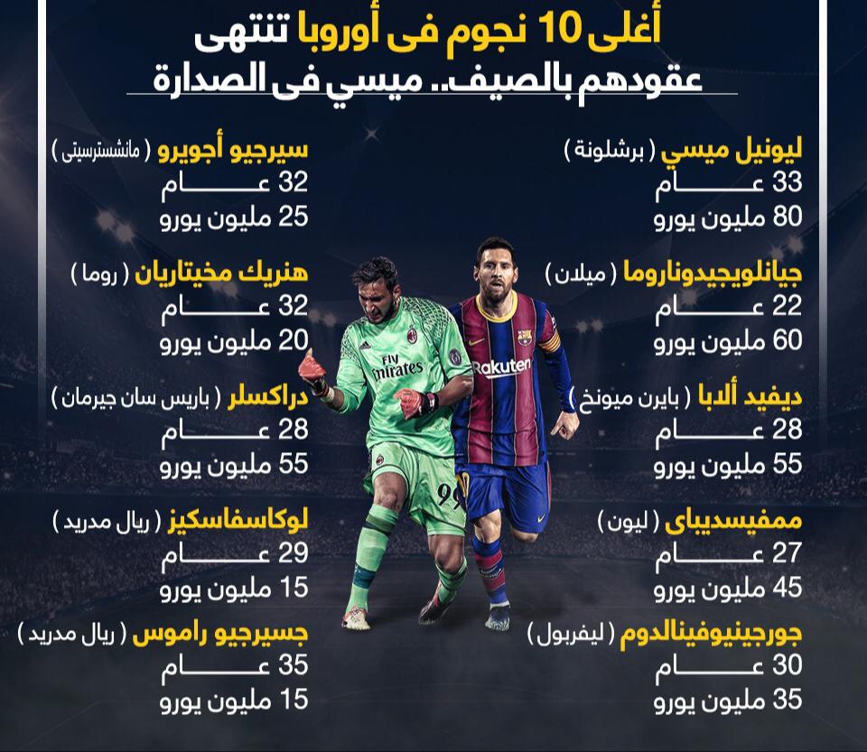 تصدر النجم الأرجنتينى ليونيل ميسي، قائمة نجوم كرة القدم الذي تنتهى عقودهم مع أنديتهم في الدوريات الأوروبية الخمس الكبرى “بيج فايف” خلال فترة الانتقالات الصيفية المقبلة عقب نهاية الموسم الكروى الجارى 2020-2021، حيث تحدد موقف العديد منهم بالرحيل عن أنديتهم، بينما مازالت المفاوضات جارية بين البعض الأخر من اللاعبين مع مسئولي الأندية لحسم عملية تجديد عقودهم.