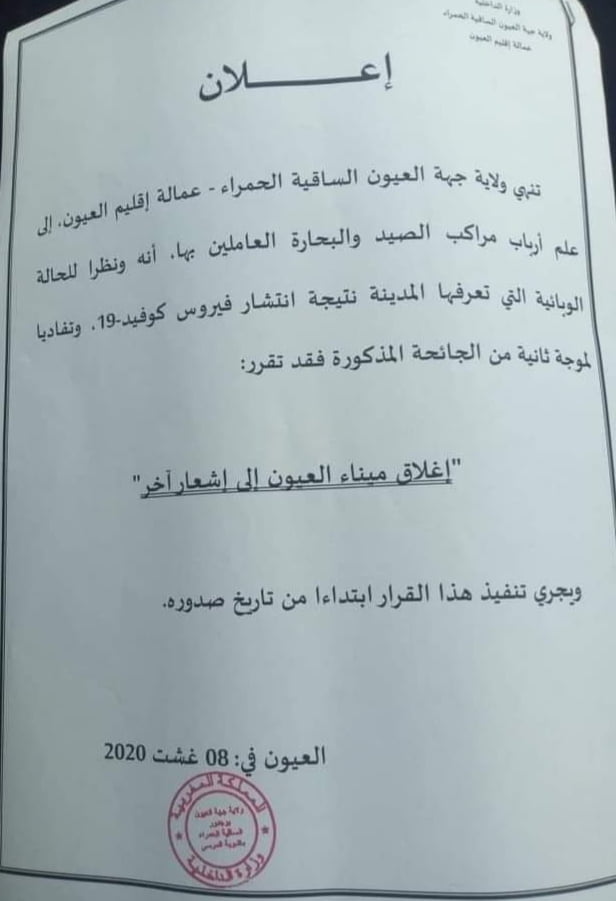 أعلن والي جهة العيون الساقية الحمراء عن اغلاق ميناء العيون ابتداءا من اليوم السبت إلى اشعار اخر وذلك بسبب الحالة الوبائية التي تعرفها المدينة نتيجة انتشار فيروس كوفيد 19 وتفاديا لموجة ثانية من الجائحة.