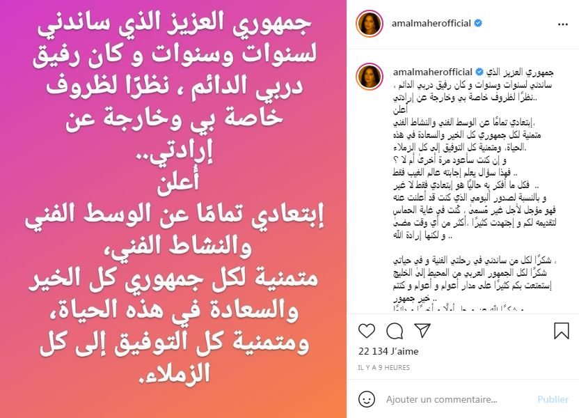 وقالت أمال في حسابها الرسمي على الإنستغرام: ” جمهوري العزيز الذي ساندني لسنوات وسنوات و كان رفيق دربي الدائم ، نظرًا لظروف خاصة بي وخارجة عن إرادتي..