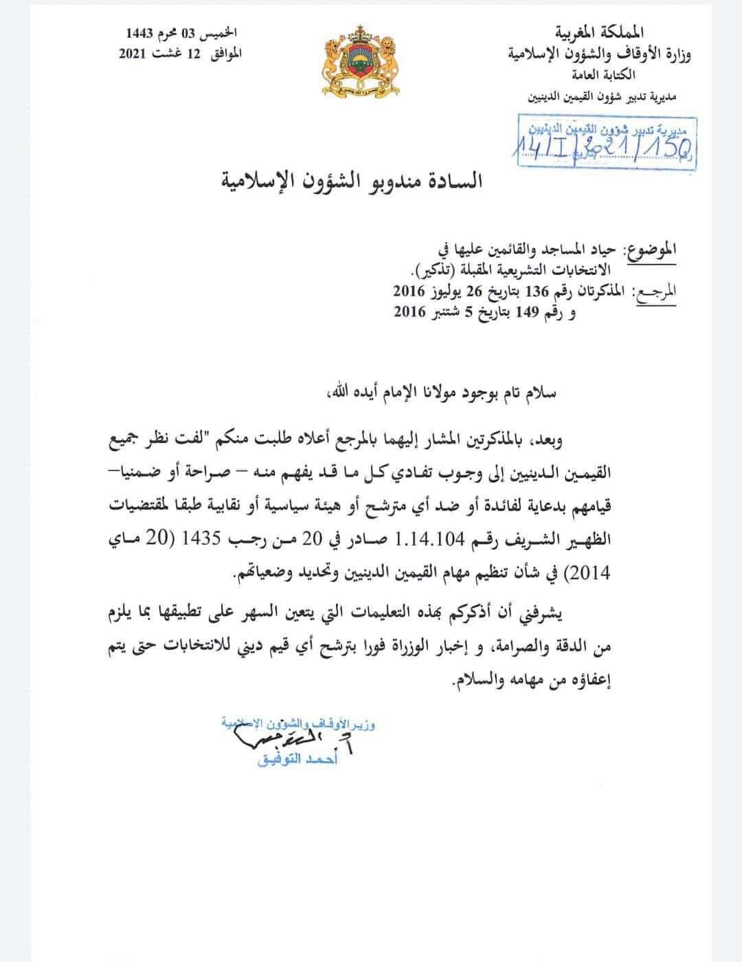 وذكر التوفيق المندوبين بضرورة السهر على تطبيق هذه التعليمات “بما يلزم من الدقة والصرامة وإخبار الوزارة فورا بترشح أي قيم ديني للانتخابات، حتى يتم إعفاؤه من مهامه”.