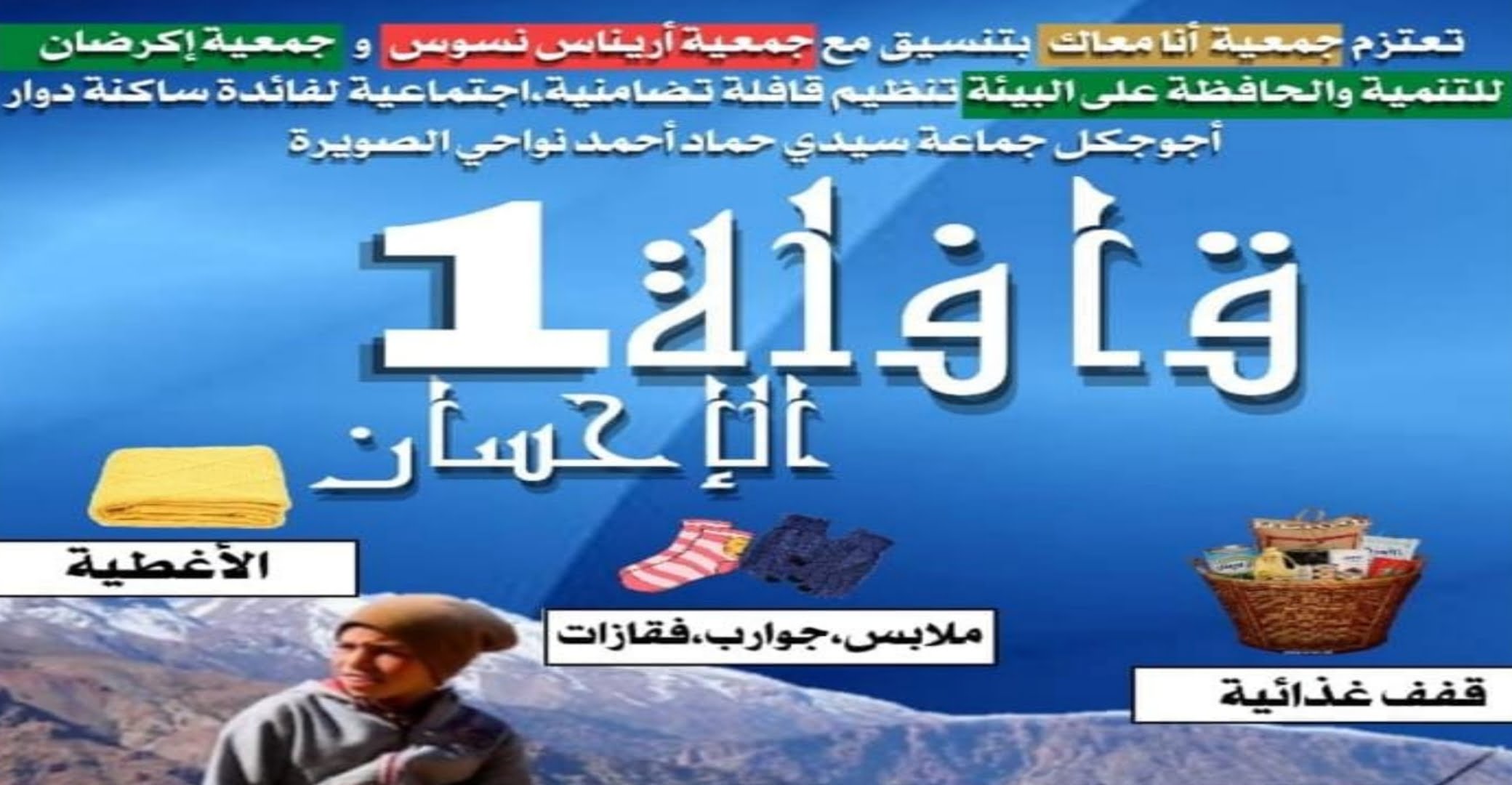 تعتزم جمعية أنا معاك بتنسيق مع جمعية أريناس نسوس و جمعية إكرضان للتنمية والمحافظة على البيئة تنظيم قافلة تضامنية، اجتماعية لفائدة ساكنة دوار أجوجکل جماعة سيدي حماد أحمد نواحي الصويرة، و ذلك يومي 11و12 دجنبر 2021.