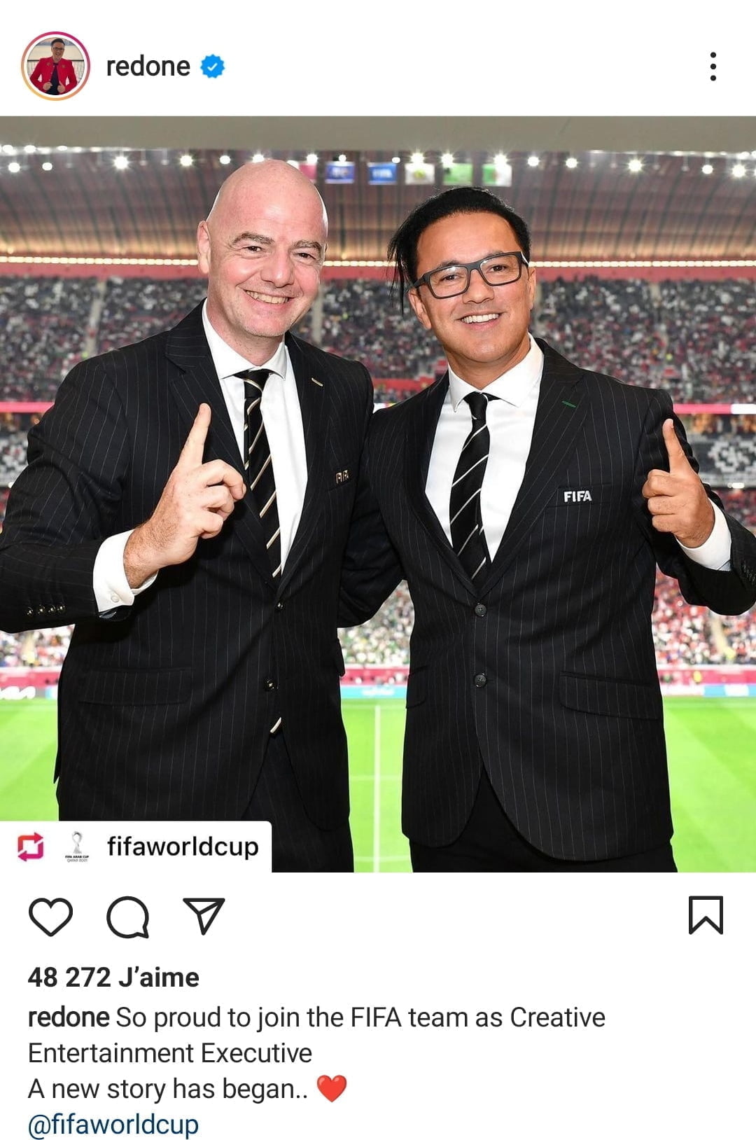 ونشر ريدوان على صفحته على إنستغرام صورة مع رئيس الفيفا جياني إنفانتينو، قائلا: ‘فخور جدًا بالانضمام إلى فريق FIFA بصفته مديرًا مبتكرًا للترفيه ..بدأت قصة جديدة ..’