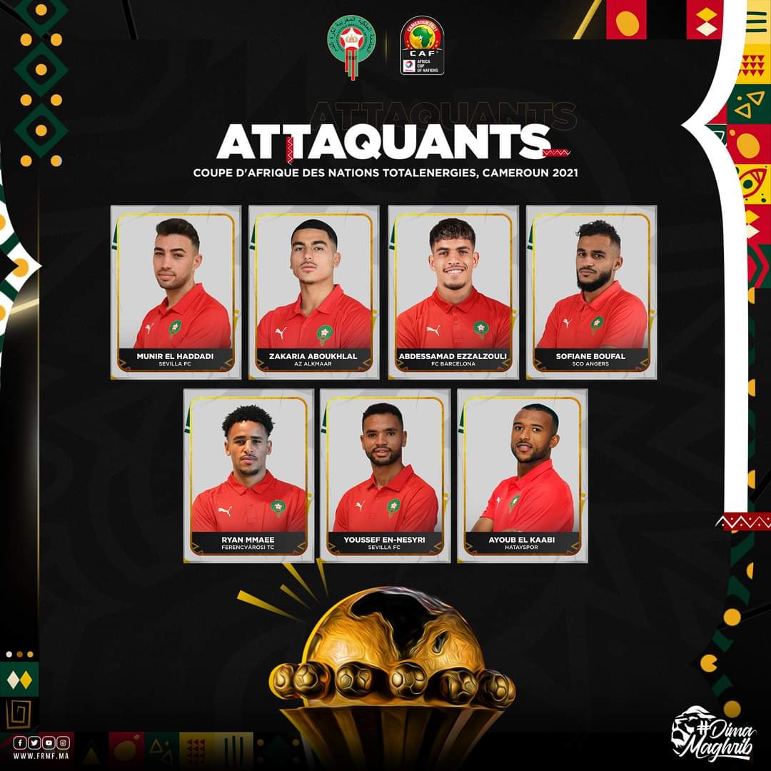 – خط الهجوم .. منير الحدادي (إشبيلية الإسباني)، سفيان بوفال (أنجيه الفرنسي) ،ريان مايي (فيرينكفاروس المجري)، يوسف النصيري (اشبيلية الإسباني)، أيوب الكعبي (هاتاي سبور التركي) عبد الصمد الزلزولي (برشلونة الاسباني)، زكرياء أبو خلال (ازد الكمار الهولندي)