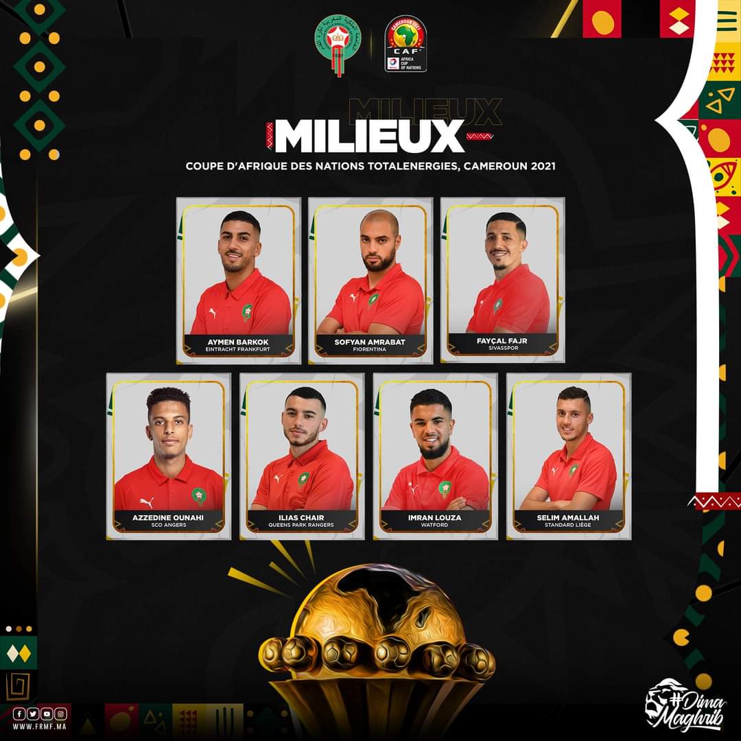 – وسط الميدان ..فيصل فجر (سيفاس سبور التركي)، سفيان أمرابط (فيورونتينا الإيطالي)، سليم املاح (ستاندارد دو لييج البلجيكي)،أيمن برقوق (فرانكفورت الألماني)، إلياس شاعر (كوينز بارك رينجرز الإنجليزي)، عمران لوزا (واتفورد الإنجليزي ،عز الدين اوناهي (انجي الفرنس).