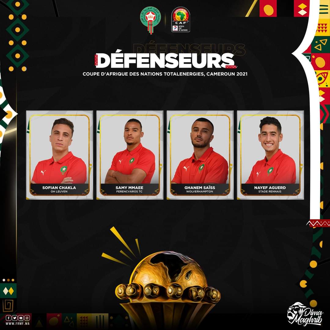 – خط الدفاع .. أشرف حكيمي (سان جيرمان الفرنسي)، وسفيان ألكوش (ميتز الفرنسي)، وآدم مسينا (واتفورد الإنجليزي)، وسفيان الكرواني (نيميغين الهولندي)، سامي مايي (فيرنكفاروس المجري )،سفيان شاكلا (فياريال الإسباني)، غانم سايس (وولفرهامبتون الإنجليزي)، نايف أكرد (رين الفرنسي).
