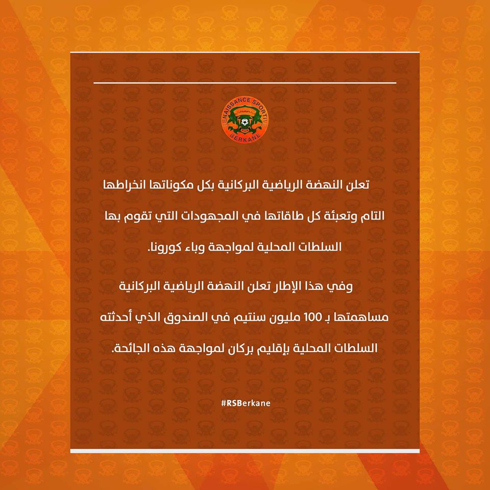 وجاء في بلاغ الفريق على صفحته الرسمية “هضة بركان يعلن مساهمته بـ 100 مليون سنتيم في الصندوق الذي أحدثته السلطات المحلية بإقليم بركان لمواجهة وباء كورونا كما يؤكد انخراطه التام بكل مكوناته في المجهودات التي تقوم بها السلطات المحلية لمواجهة هذه الجائحة”