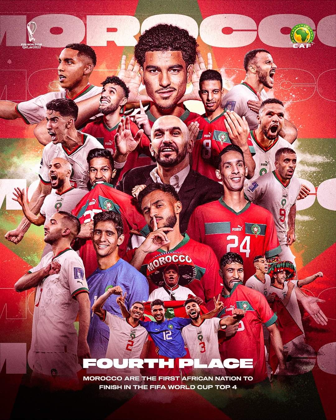 وأفاد الاتحاد الإفريقي لكرة القدم “كاف”، إن المنتخب الوطني المغربي نجح في تحقيق حلمه في نهائيات كأس العالم “مونديال قطر 2022″، مشيرا إلى أن احتلال المركز الرابع، “أفضل نهاية على الإطلاق من قبل دولة إفريقية”، في نهائيات كأس العالم.