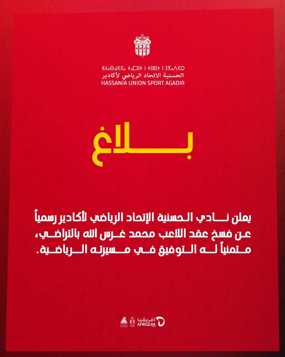 أعلن نادي حسنية أكادير، قبل قلبل من يومه الإثنين، رسميا عن فسخ عقد المهاجم محمد غرس الله بالتراضي.