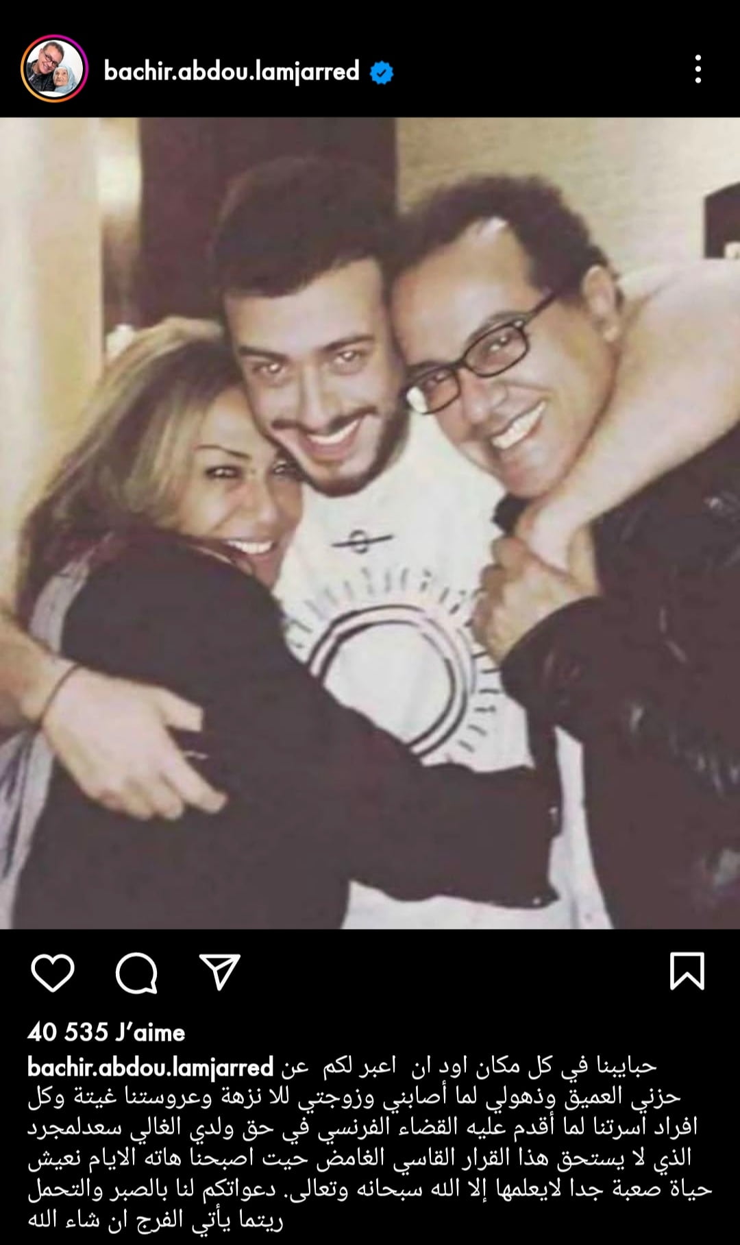 وكتب والد سعد لمجرد: “حبايبنا في كل مكان أود أن أعبر لكم عن حزني العميق وذهولي لما أصابني وزوجتي للا نزهة وعروستنا غيتة وكل أفراد أسرتنا لما أقدم عليه القضاء الفرنسي في حق ولدي الغالي سعد لمجرد الذي لا يستحق هذا القرار القاسي الغامض.. حيت أصبحنا هاته الأيام نعيش حياة صعبة جدا لا يعلمها إلا الله سبحانه وتعالى”.