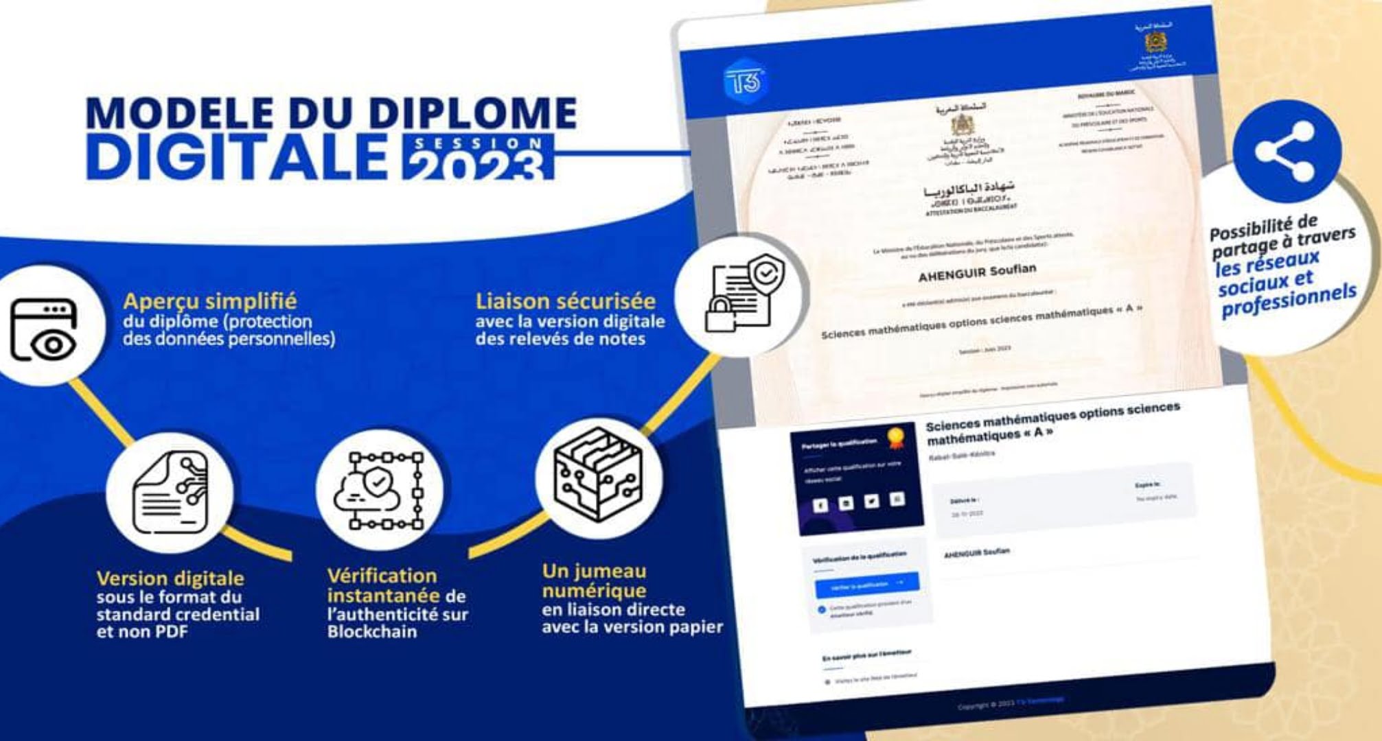 وأشار البلاغ إلى أنه تم إطلاق هذا المشروع بتعاون مع شركة مغربية رائدة في هذا المجال تابعة لمنظومة جامعة محمد السادس المتعددة التخصصات التقنية، مما يشكل إضافة نوعية في مجال تأمين شهادة البكالوريا وبيان النقط، وكذا تطوير الشكل المادي للشهادة لتصبح لها خاصية رقمية تفاعلية.