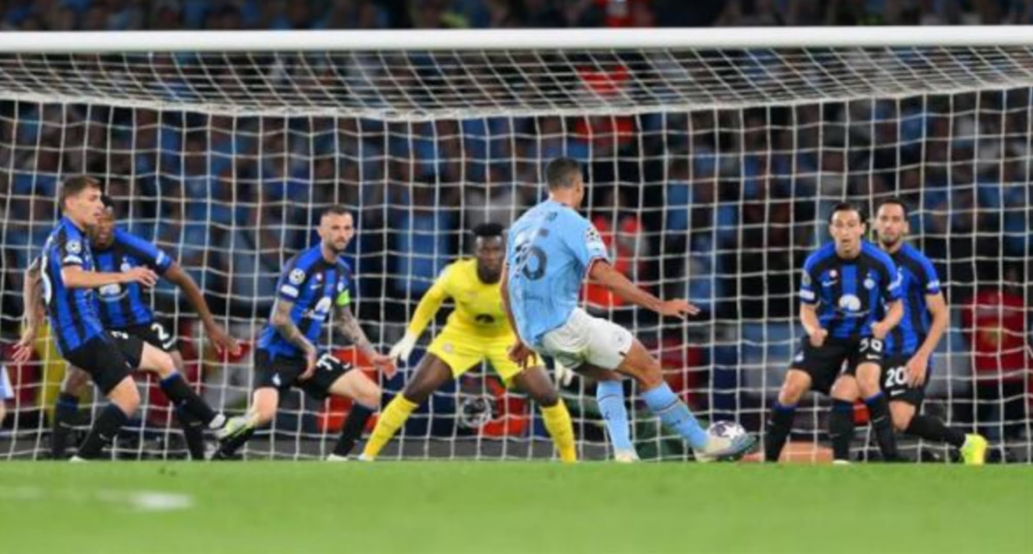 وبدأت المباراة بصلابة دفاعية من إنتر، واحتاج سيتي إلى 27 دقيقة قبل أن يصنع كيفن دي بروين أول فرصة خطيرة حيث مرر كرة أرضية إلى إرلينغ هالاند الذي سدد كرة قوية أنقذها الحارس أندريه أونانا.