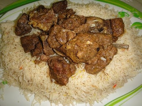 حتى ينضج الأرز نعيد اللحم فوقه حتى يسخن.