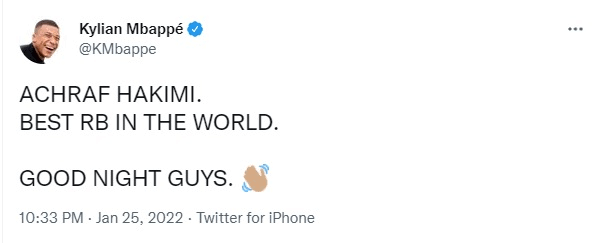 وبعد هدف حكيمي، نشر مبابي تغريدة باللغة الإنجليزية على حسابه بموقع التواصل الاجتماعي “تويتر” قال فيها: “أشرف حكيمي.. أفضل ظهير أيمن في العالم.. ليلتكم سعيدة يا رفاق”.