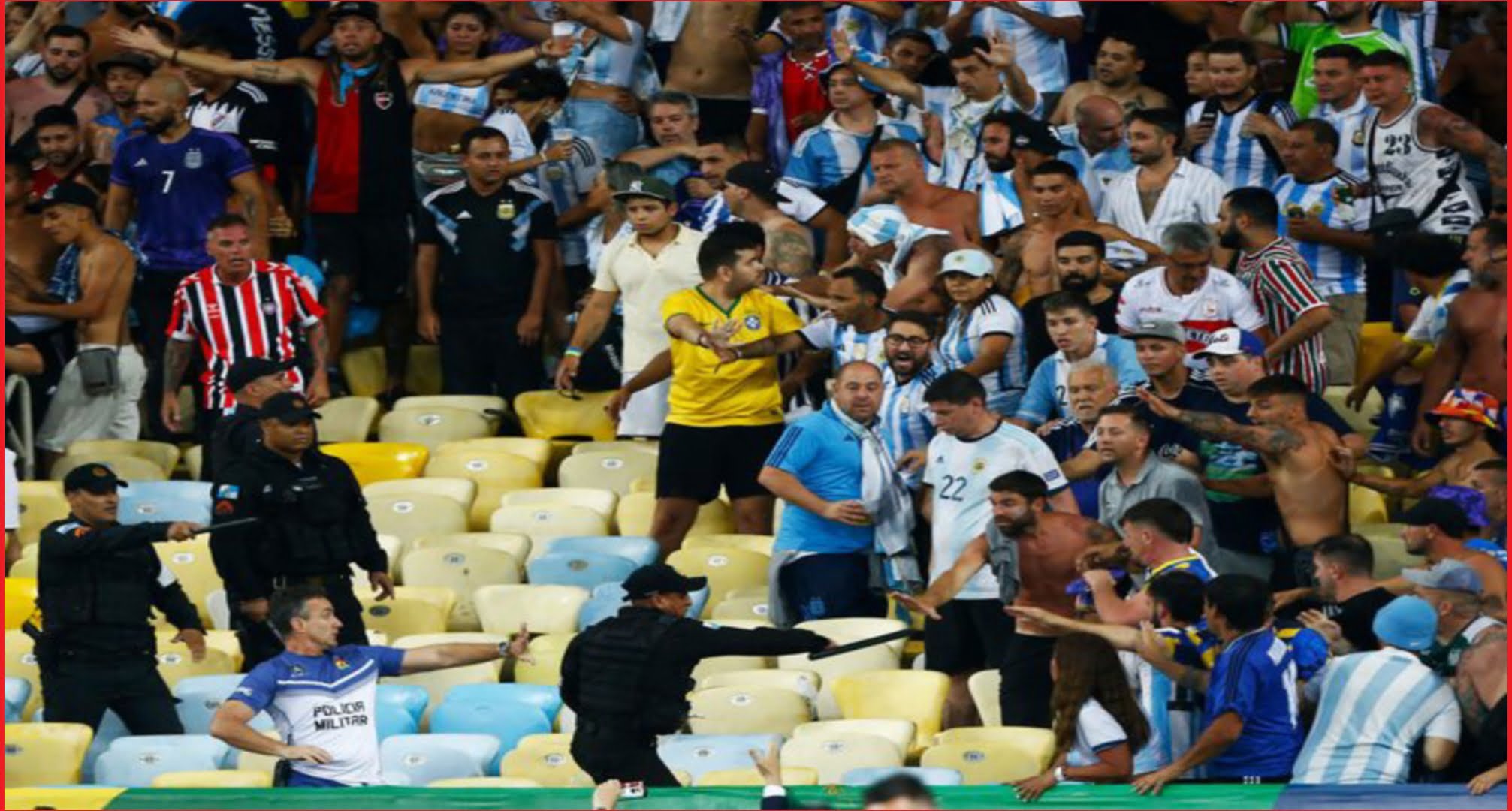 ودخل الملعب الشهير في حالة من الفوضى، حيث حاول اللاعبون عبثًا إقناع الجماهير بوقف الاشكال. وتقدم قائد الأرجنتين ليونيل ميسي زملاءه الذين توجهوا الى غرفة تبديل الملابس، ولم يعودوا إلا بعد وقف أعمال العنف.