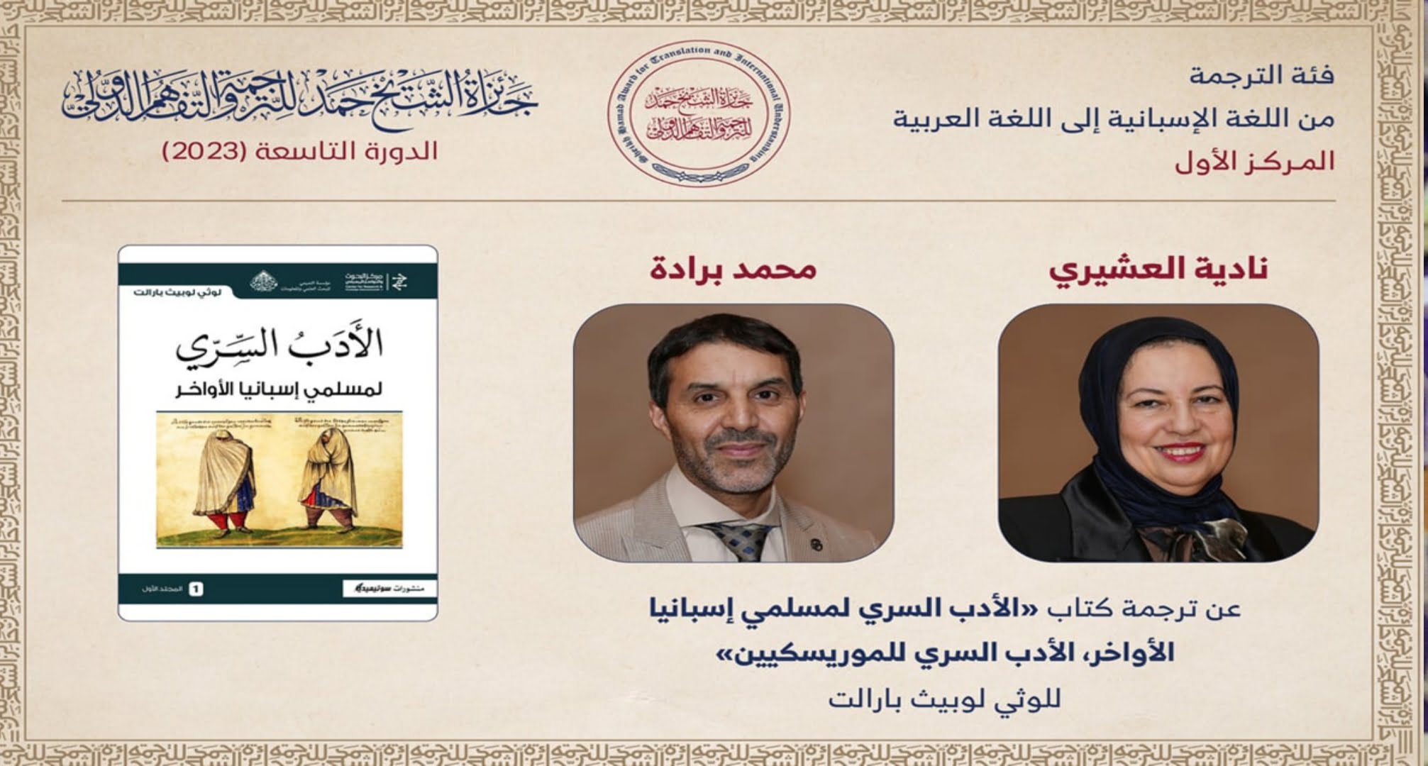وهكذا تم تتويج محمد برادة أستاذ الأدب الاسباني بكلية الاداب والعلوم الانسانية ظهر المهراز بفاس ونادية العشيري الاستاذة بمدرسة الملك فهد العليا للترجمة عن عملهما المشترك الذي هو عبارة عن ترجمة من الإسبانية الى العربية لكتاب “الأدب السري لمسلمي إسبانيا الأواخر” لمؤلفته الباحثة والمؤرخة في جامعة بورتو ريكو بأمريكا اللاتينية لوثي لوبيث بارالت التي تعتبر من بين أحفاد “الموريسكيين”.