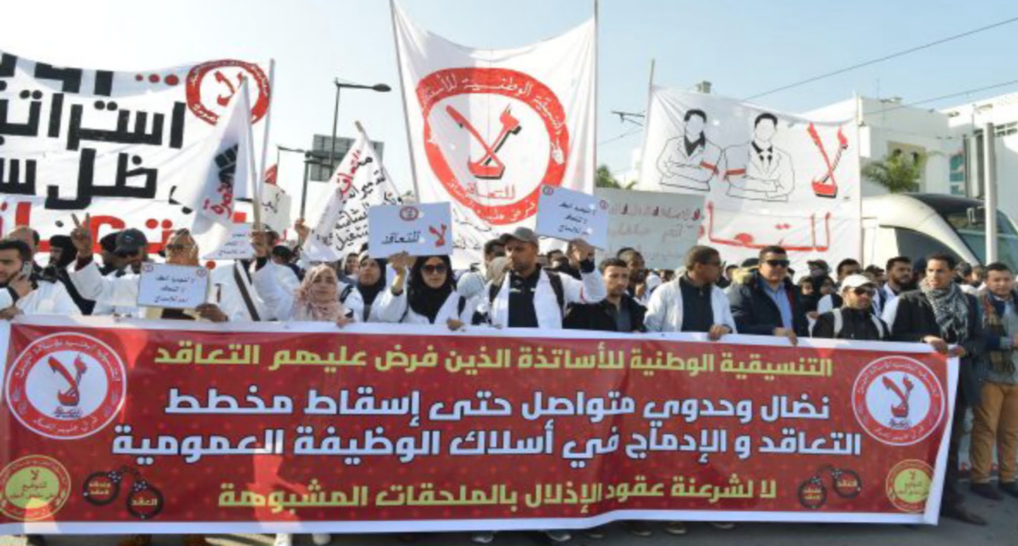 أعلنت “التنسيقية الوطنية للأساتذة وأطر الدعم الذين فرض عليهم التعاقد “مواصلة” المعركة النضالية التي تخوضها من أجل إسقاط مخطط التعاقد وإطاره التشريعي؛ والنظام الأساسي الخاص بموظفي قطاع التربية الوطنية، والمطالبة بالإدماج في أسلاك الوظيفة العمومية”.
