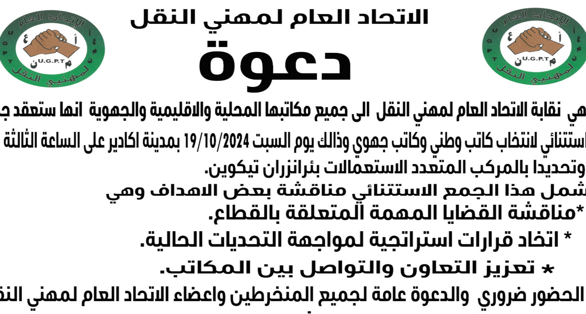 تستعد نقابة الاتحاد العام لمهنيي النقل لعقد جمع عام استثنائي يوم السبت 19 أكتوبر 2024، في مدينة أكادير، على الساعة الثالثة زوالا، بالمركب المتعدد الاستعمالات بئرنزران تكيوين، حيث سيتم انتخاب كاتب وطني وكاتب جهوي جديدين، ويأتي هذا الحدث في إطار جهود الاتحاد لتعزيز تمثيلية المهنيين في القطاع وتحسين ظروف العمل.