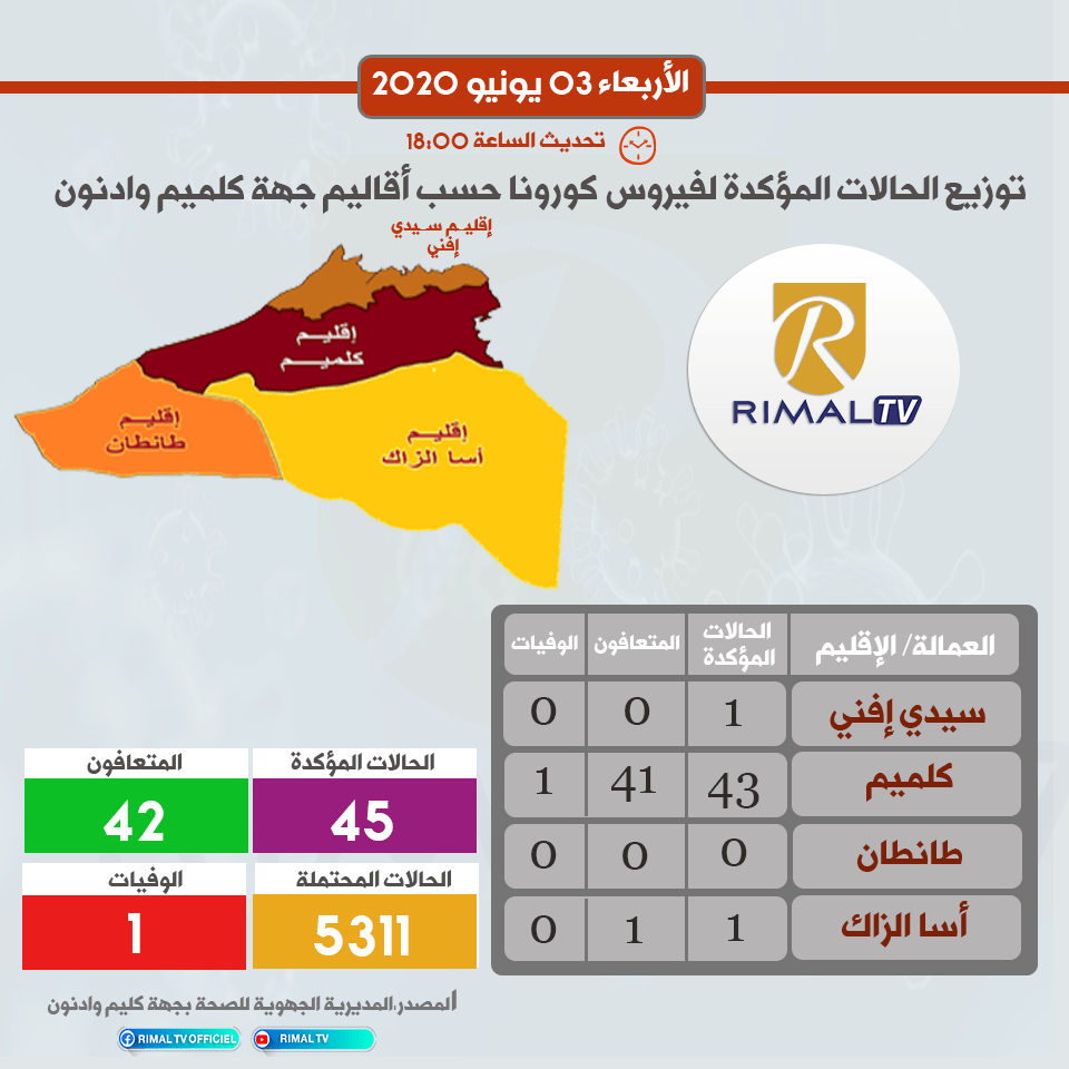ويبلغ العدد الإجمالي للحالات المسجلة بالجهة، الى حدود اليوم الأربعاء على الساعة السادسة مساء، 45 حالة تعافت منها 42 حالة.