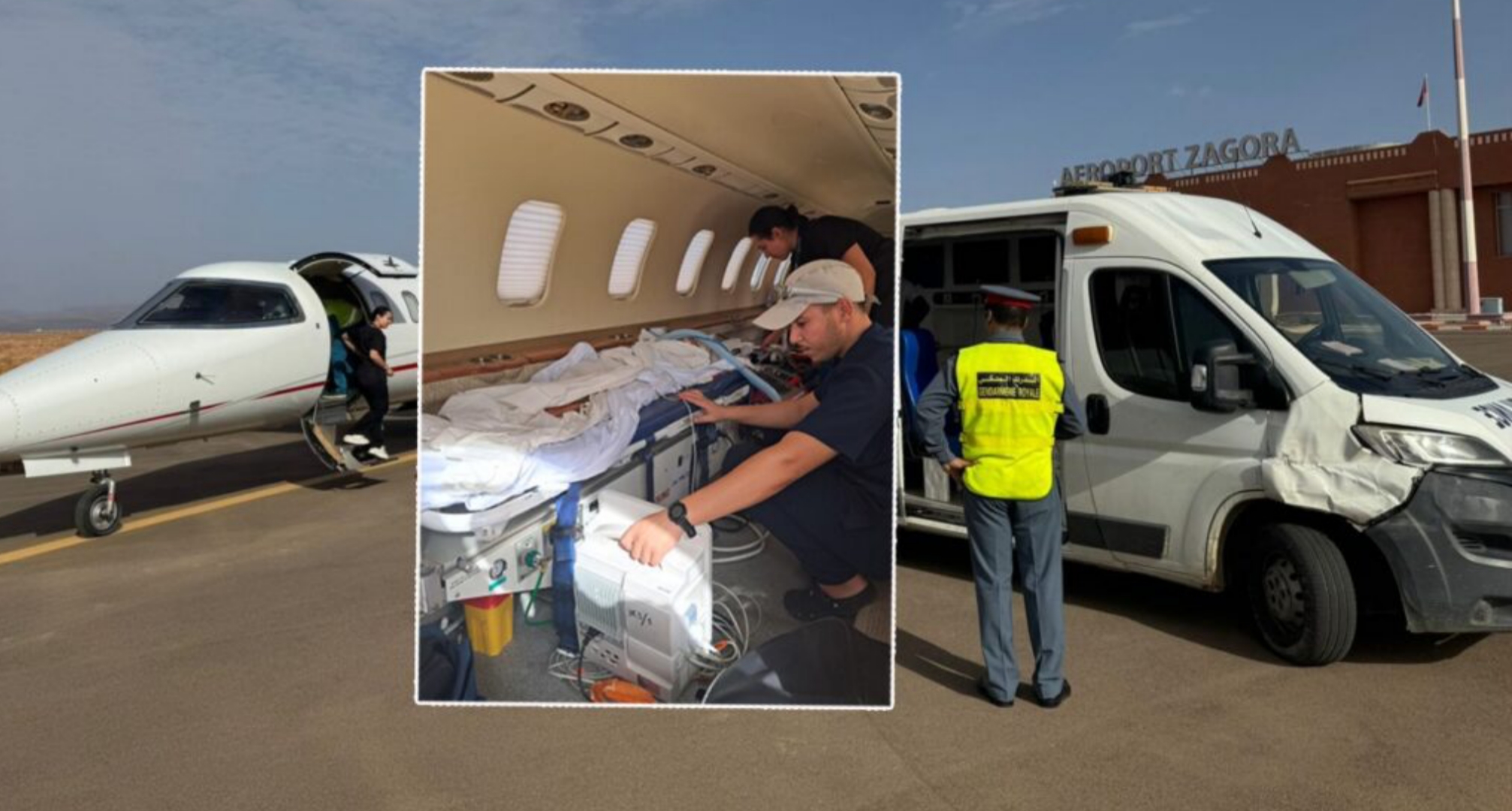 وتم نقل الطفل، الذي كان يتلقى الرعاية في مصلحة الإنعاش بزاكورة، على متن الطائرة المجهزة بجميع الوسائل الطبية الضرورية، تحت إشراف فريق صحي متخصص يضم طبيبا مختصا في الإنعاش والتخدير، وممرضا متخصصا في التخدير والإنعاش، إضافة إلى والديه.