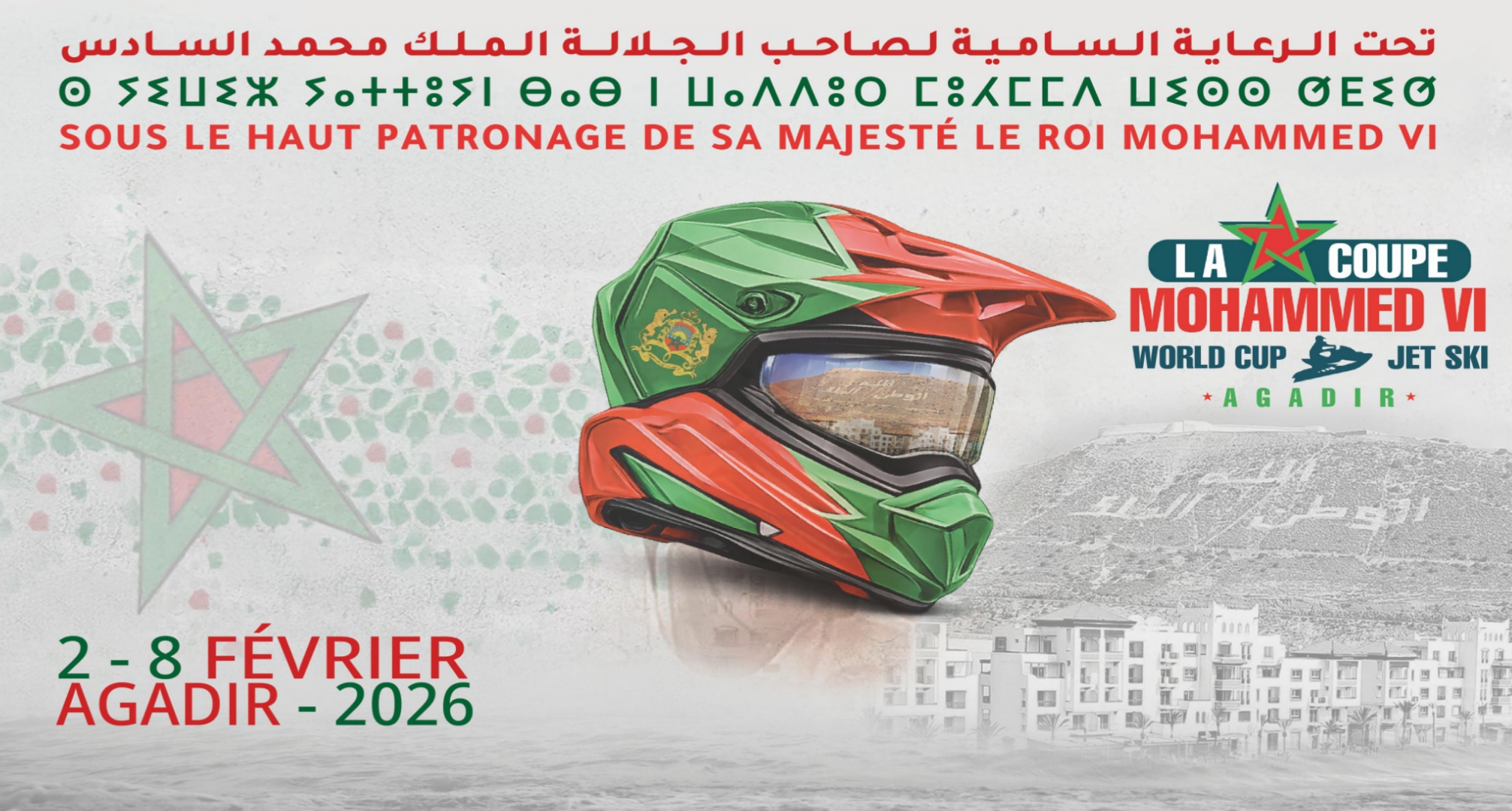 تحت الرعاية السامية لصاحب الجلالة الملك محمد السادس نصره الله وأيده، تستعد مدينة أكادير لاحتضان فعاليات كأس محمد السادس للجيت سكي خلال الفترة الممتدة من 2 إلى 8 فبراير 2026، وذلك بشاطئ أكادير، في حدث رياضي دولي يعزز مكانة المغرب على خارطة الرياضات المائية العالمية.