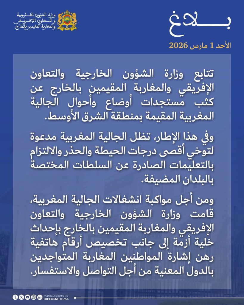 قالت وزارة الشؤون الخارجية والتعاون الإفريقي والمغاربة المقيمين بالخارج أنها تتابع عن كثب مستجدات أوضاع وأحوال الجالية المغربية المقيمة بمنطقة الشرق الأوسط.