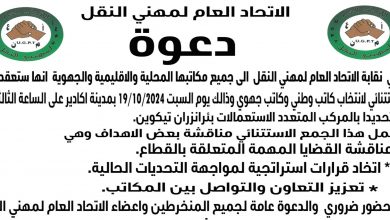 تستعد نقابة الاتحاد العام لمهنيي النقل لعقد جمع عام استثنائي يوم السبت 19 أكتوبر 2024، في مدينة أكادير، على الساعة…